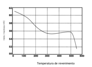 No gráfico abaixo é possível ver a variação da dureza do material após têmpera e durante o revenimento. Para obtenção dos maiores valores de dureza, o revenimento deve ser feito na
